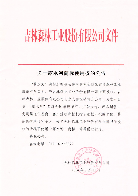 關(guān)于露水河商標(biāo)使用權(quán)的公告